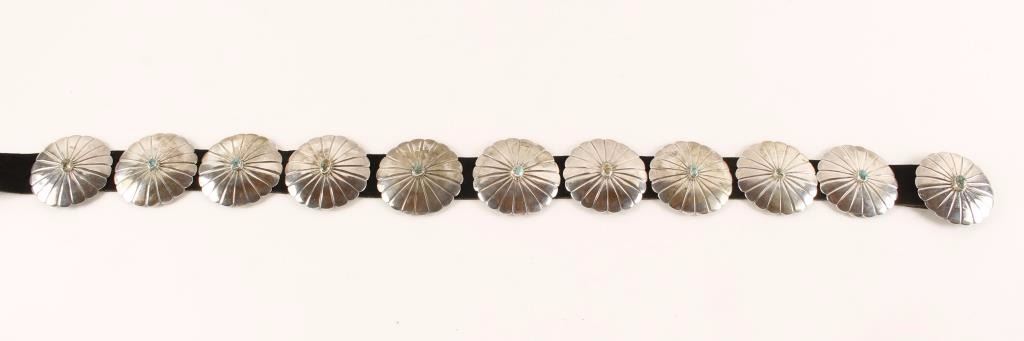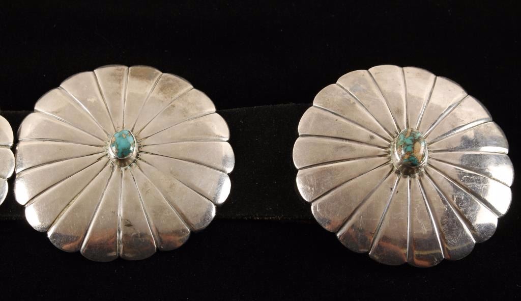 The conchos are about 3" across and have lovely pieces of Morenci turquoise in the middle. The belt is approx. 41" long and weighs just over 1lb.