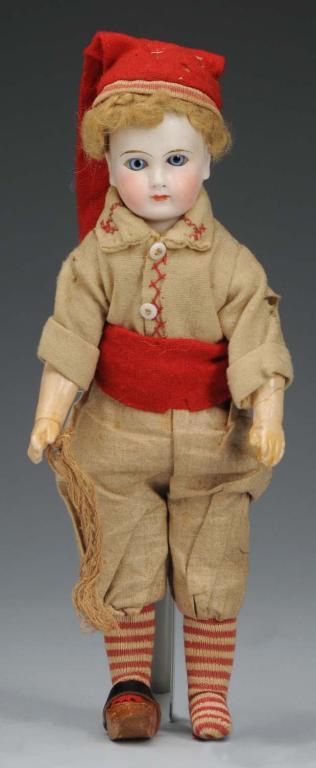 Description Closed mouth, bisque flange-neck head with blue glass sleep eyes, closed mouth, and one-stroke eyebrows on wood and composition body. Doll dressed in original linen costume with hat, striped stockings, and one wooden shoe. Condition (Very Good). Size 10 - 1/2" T.