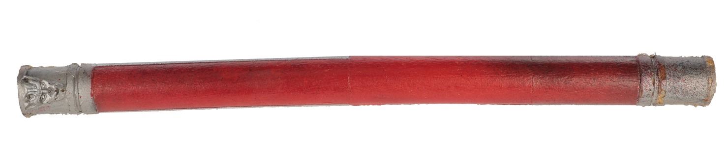 212. Ben Affleck "Daredevil" stunt billy club from Daredevil. (TCF, 2003) Original stunt baton constructed of cast foam rubber over internal metal armature expertly painted metallic silver and red, featuring 2-relief lions at top, measuring approx. 13 x 1 in. Exhibiting production wear. In very good to fine condition. Prop Store COA. $1,200 - $1,500