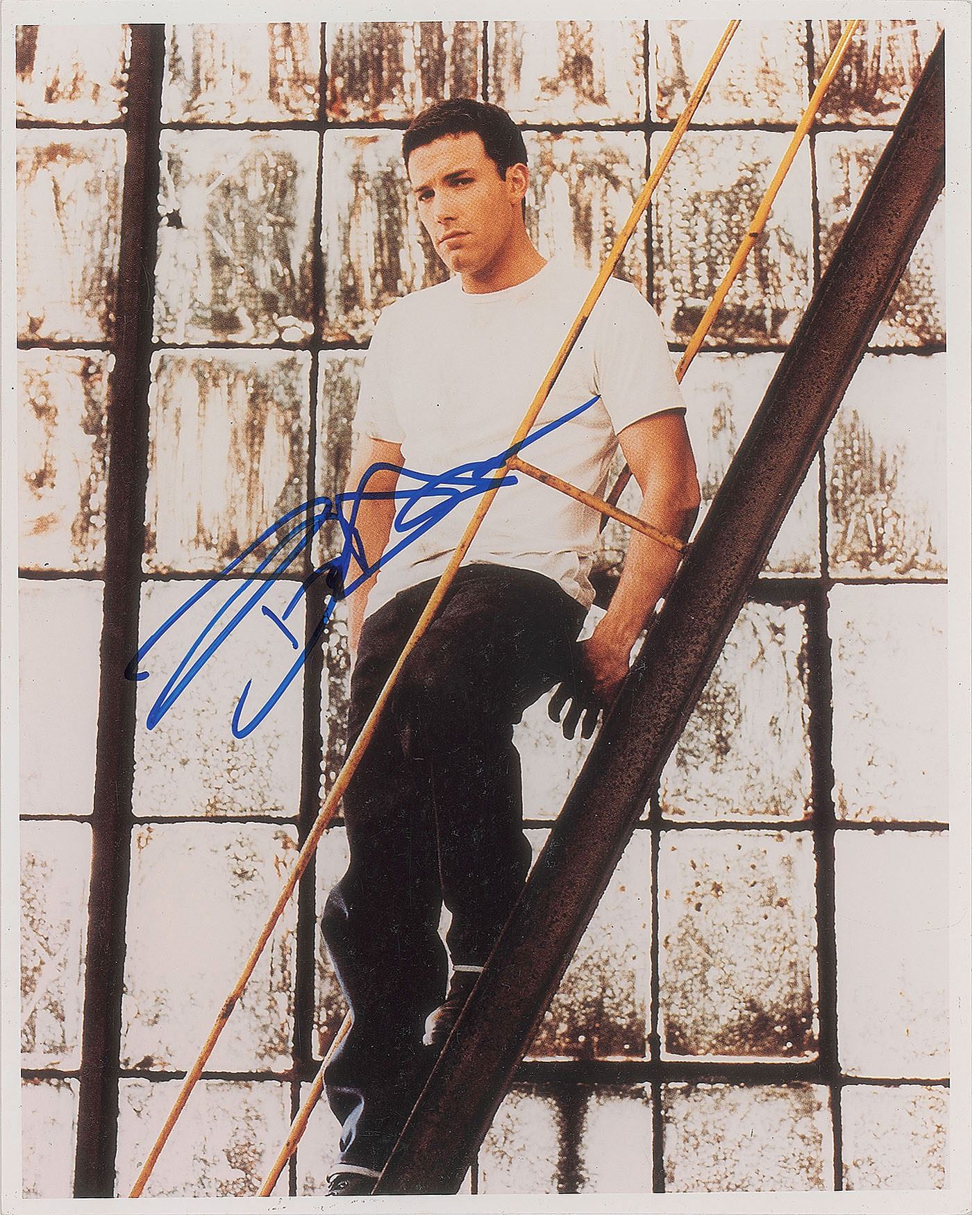 Color glossy 8 x 10 photo of Affleck posing in a warehouse on a metal staircase, signed in blue felt tip. In fine condition.
