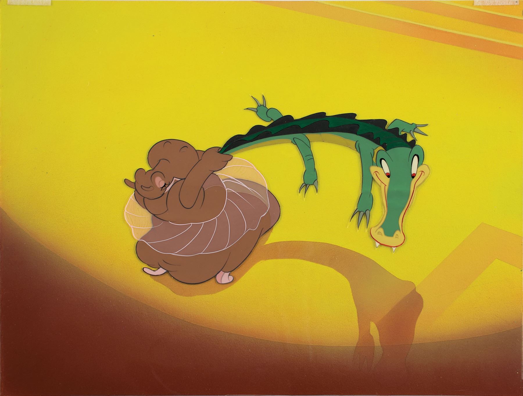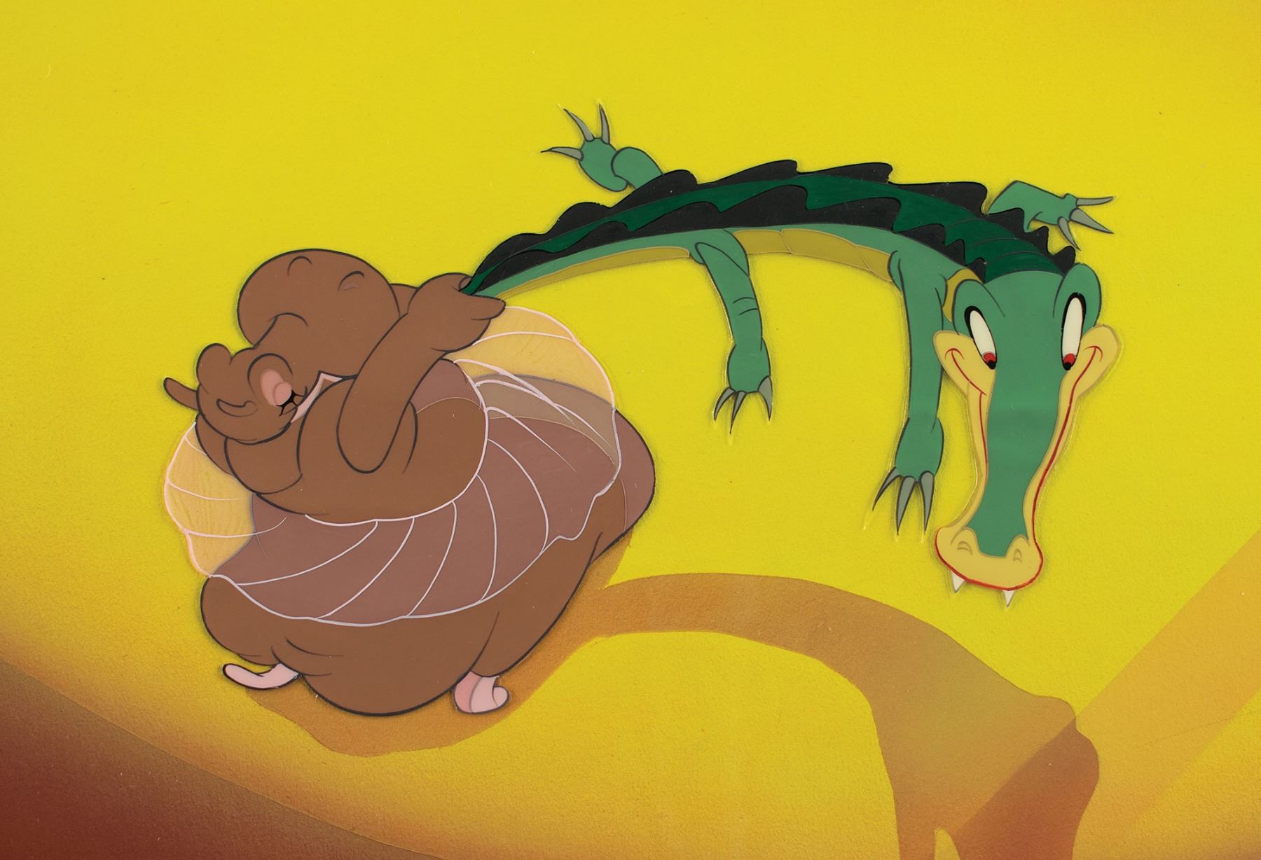 (Walt Disney Studios, 1940) Beautiful original production cel of Ben Ali Gator and Hyacinth Hippo from Fantasia, showing the unlikely dancing partners during the 'Pastoral Symphony' sequence. The cel is slightly trimmed and placed on a hand-painted custom prepared background. Total character image measures 7 x 4.5, with overall dimensions of 12.25 x 9.5. In fine condition.
