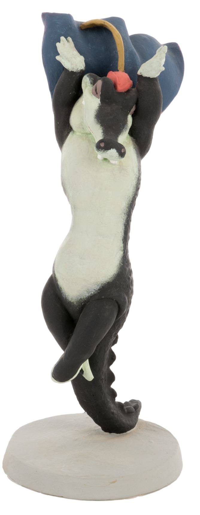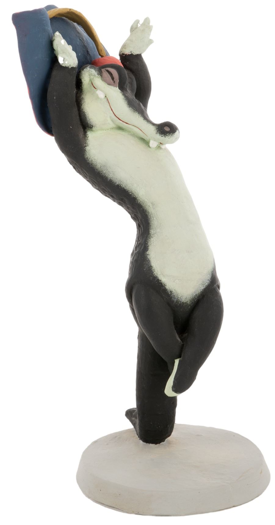363. "Ben Ali Gator" ballerino animator's maquette from Fantasia.(Disney, 1940) Vintage original maquette constructed of solid cast plaster, expertly studio painted. Measuring approx. 9 x 3.75 x 3.5 in. Black ink stamp on bottom, "Return to Character Model Dept.". Maquettes like these were produced early on in the planning stages to give animators a 3-D reference model to create their drawings. These incredibly fragile items rarely survived the test of time, finding one in this state is a rare treat. Exhibiting minor production wear. In very good to fine condition. $2,000 - $3,000
