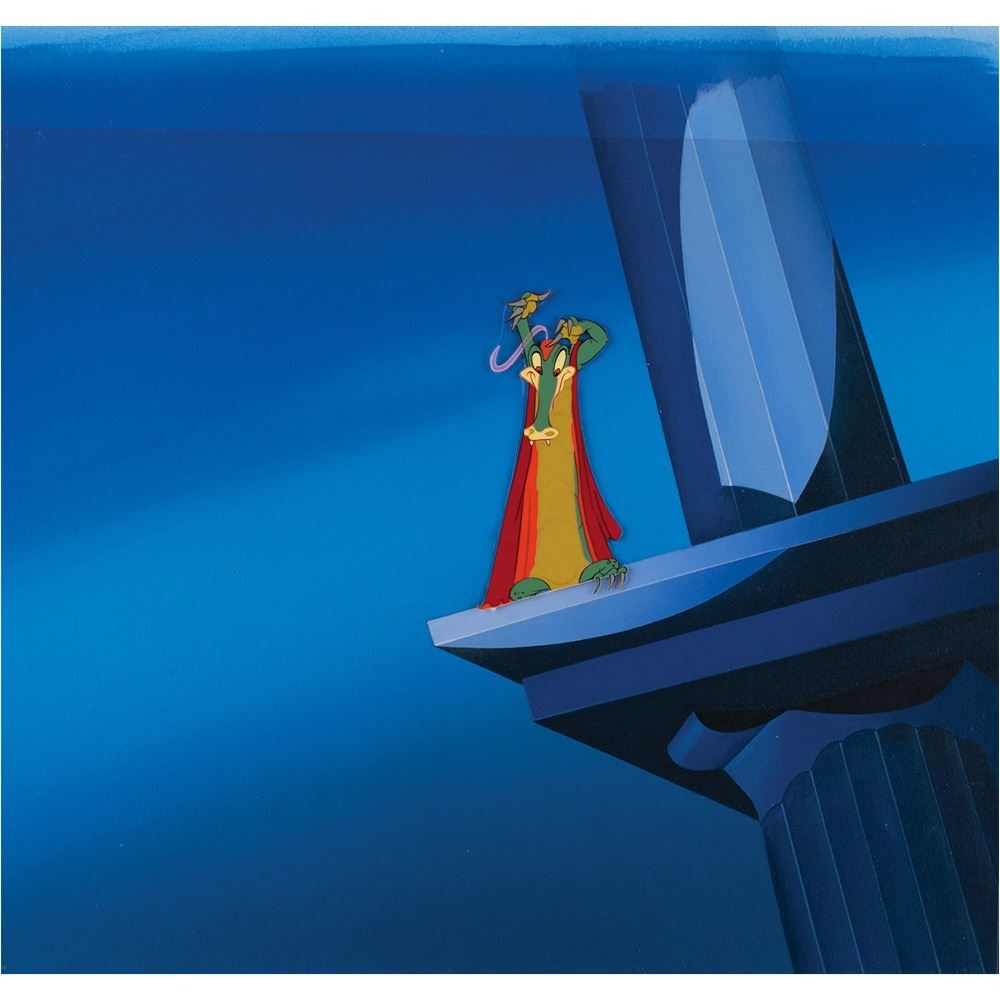 (Walt Disney Studios, 1940) Original production cel of Ben Ali Gator from Fantasia, which depicts the romantic dancing alligator standing on the ledge of a large column during the 'Dance of the Hours' segment. The cel has been trimmed to form, applied to a new cel, and placed on a modern and matching hand-painted presentation background. Character image measures 2.5 x 5, with overall dimensions of 17.75 x 16. Matted to an overall size of 22.25 x 20. In fine condition.