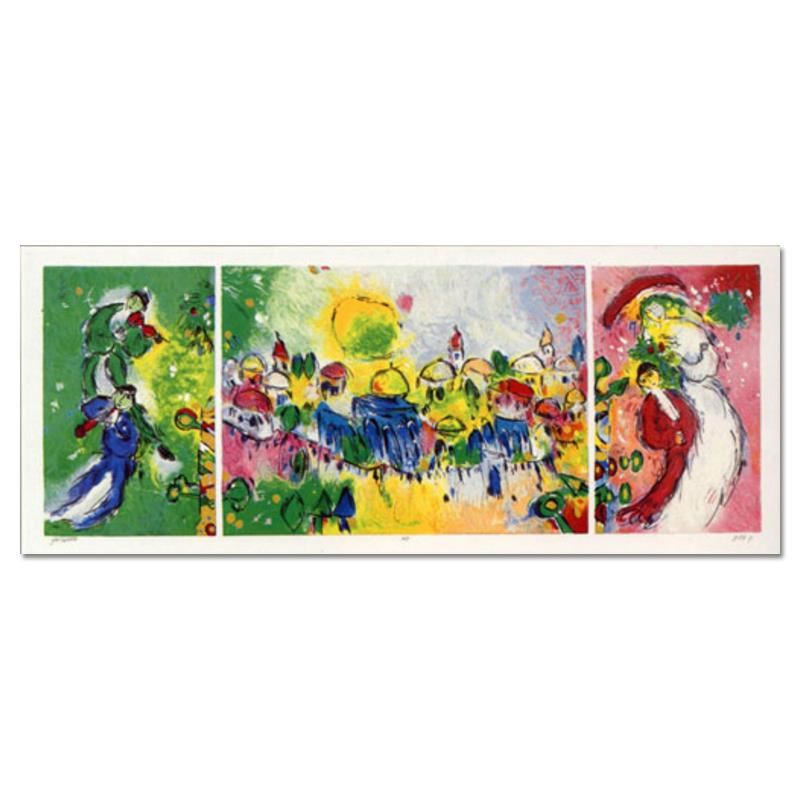 "Mazal Tov", is a limited edition Serigraph on Paper by Ben Avram. Numbered and hand signed, this piece is accompanied by a letter of authenticity. Measures approximately 15" x 40.5" (image).
