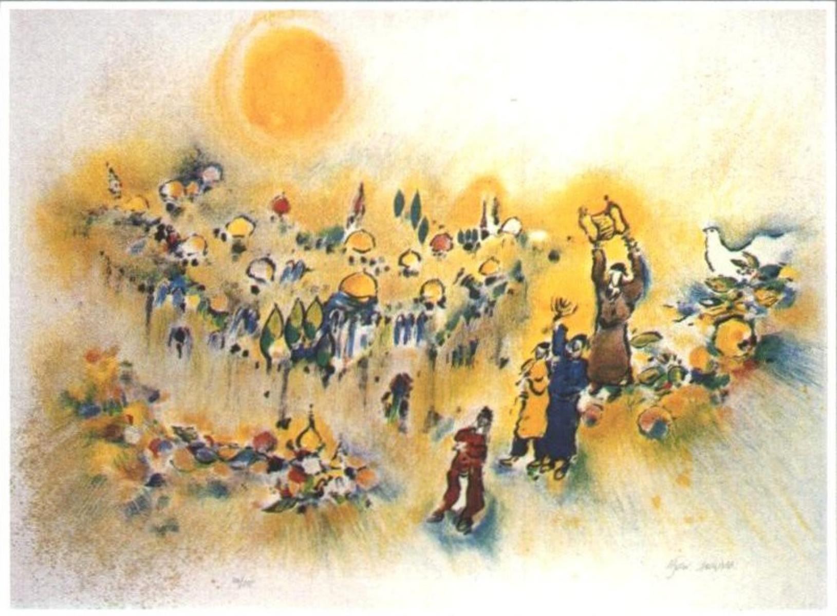 Artist: Ben Avram. Medium: Original Serigraph. Title: Jerusalem of gold. Size (Unframed): 18" x 24.5". Certificate of Authenticity: From the publisher.