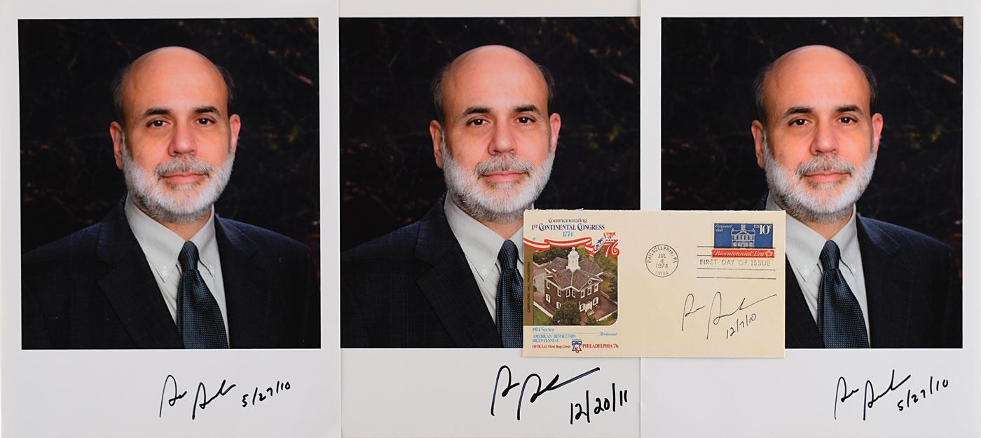 Four items signed by the former Federal Reserve chairman: three identical color satin-finish 8.5 x 11 portraits, each signed and dated in the lower border in black felt tip; and an FDC with a cachet honoring the first Continental Congress, signed and dated in black felt tip. In very good to fine condition, with light creases to one photo. Accompanied by two "With the Compliments of Ben S. Bernanke" cards.