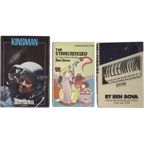 <B>Ben Bova: Three First Editions, One Signed</B></I> including: <B><I>The Starcrossed</B></I></B></I>. Radnor, Pennsylvania: Chilton Book Company, [1975]. First edition. Inscribed by the author on the front free endpaper. Octavo. 197 pages. Publisher's cream cloth with brown spine titles. In original pictorial dust jacket. Moderate edge wear to the boards and the dust jacket. Small closed tear to the top of the front panel of the dust jacket, else a fine copy. <B><I>Millenium</B></I></B></I><I>: A Novel About People and Politics in the Year 1999.</B></I> New York. Random House, [1976]. First edition. Octavo. 277 pages. Publisher's black paper spine over beige paper boards with silver spine titles. In original pictorial dust jacket. Minimal shelf wear to the bottom edge, and a lightly toned textblock edge, else fine condition.[and:] <B><I>Kinsman</B></I></B></I>. New York: The Dial Press, [1979]. First printing. Octavo. 280 pages. Publisher's black cloth with deep blue spine titles. In original pictorial dust jacket. Small closed tear to the front free endpaper, else fine condition. <I>From the Robert and Diane Yaspan Collection.</B></I><BR><BR><b>Shipping:</b> Books & Catalogs (<a target="_blank" href="http://www.heritageauctions.com/common/shipping.php">view shipping information</a>)