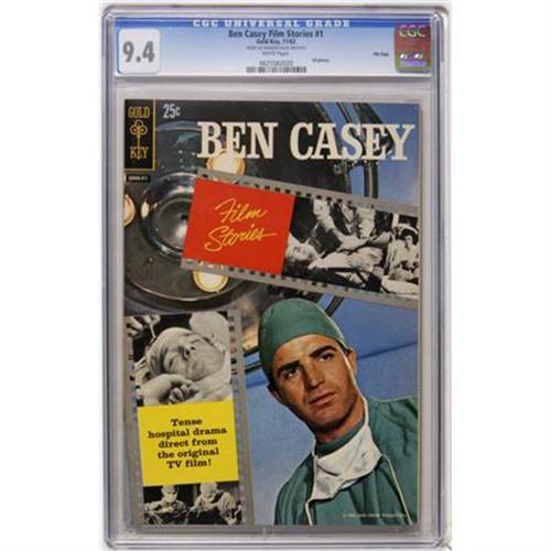 <B>Ben Casey Film Stories #30009-211 File Copy (Gold Key, 1962) CGC NM 9.4 White pages.</B></I> All photos. Photo pin-up back cover. CGC notes, "From the Random House Archives." Overstreet 2007 NM- 9.2 value = $120. CGC census 10/07: 8 in 9.4, 6 higher.<BR><BR><b>Shipping:</b> Comics - Slabbed (certified) (<a target="_blank" href="http://www.heritageauctions.com/common/shipping.php">view shipping information</a>)