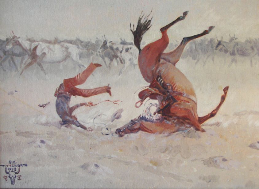 , Ben D. Tittsworth, , Oil on Board , Upset Rider And Horse , 12" x 16" , Signed Lower Left , 1958 , (7780)