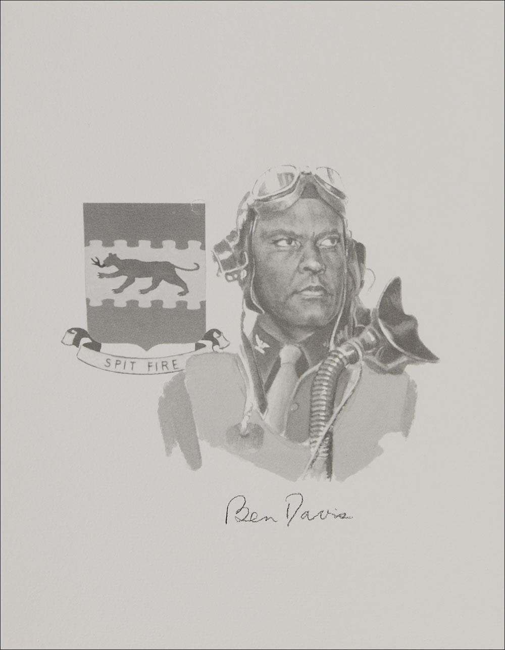 Dramatic print of Davis in uniform and aviator gear, 7.5 x 9.5, signed beneath his likeness. Matted to an overall size of 11 x 14. In fine condition.