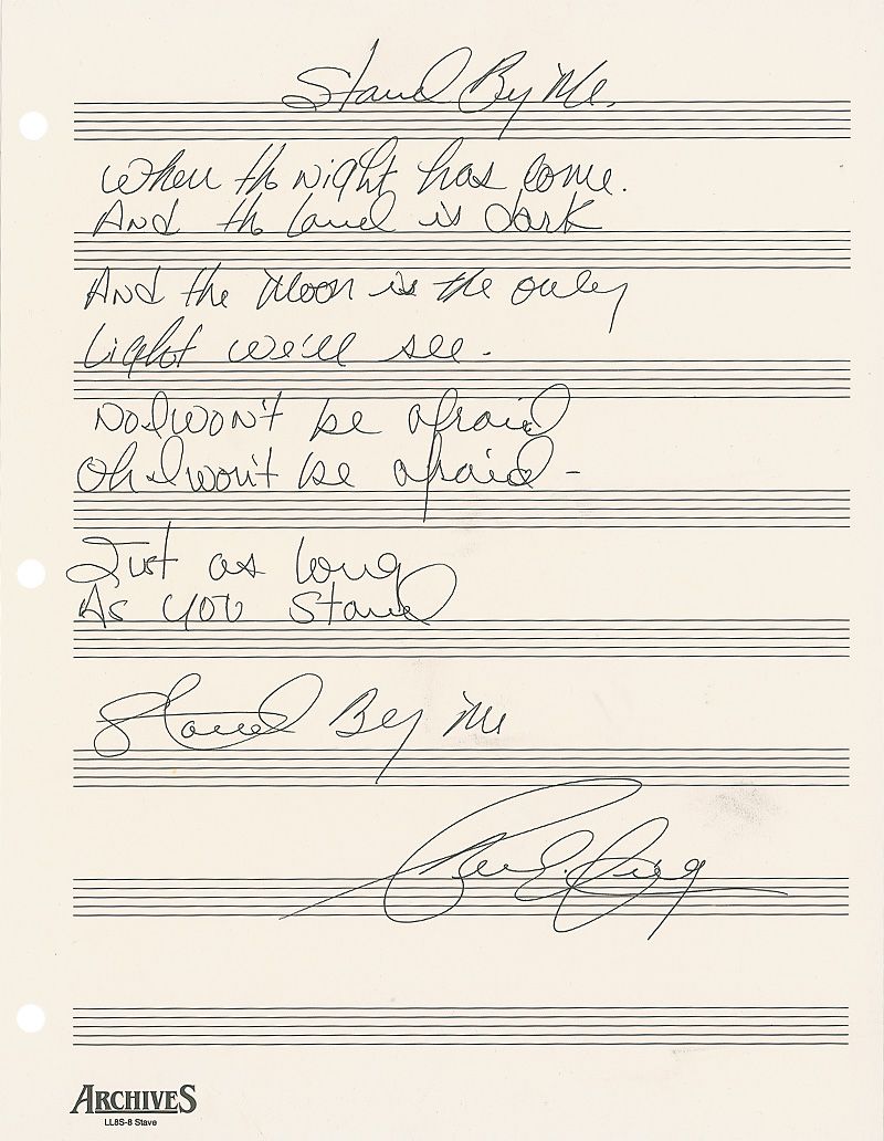 Souvenir handwritten lyrics to ‘Stand by Me,’ on an off-white 8.5 x 11 sheet of music paper. King pens the first verse to his hit song, signing at the conclusion. In fine condition, with punch holes to left edge.
