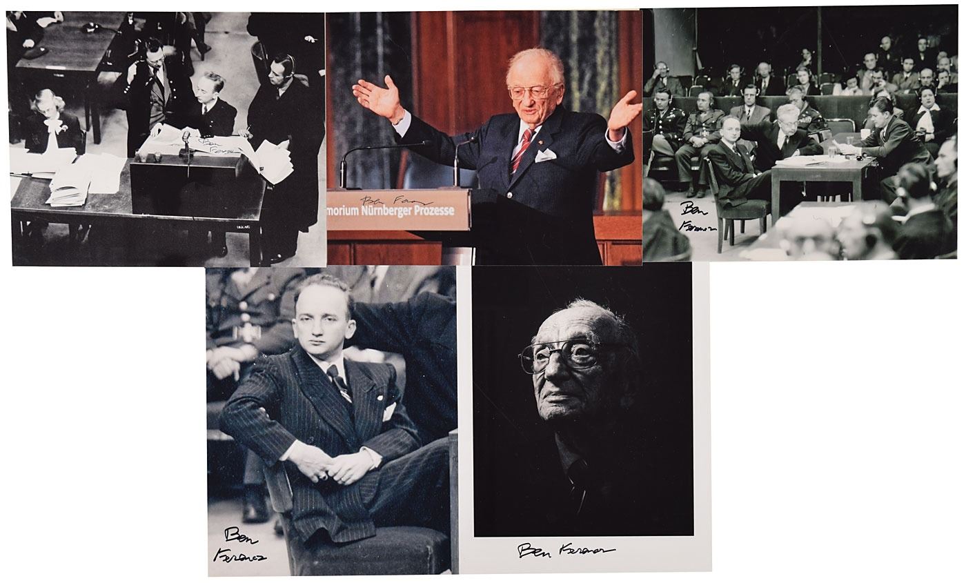 Five glossy 8 x 10 and 10 x 8 photos of the noted Nazi prosecutor at various stages of his career, each signed in black ink or felt tip by Ben Ferencz. In overall fine condition. Accompanied by a personal business card belonging to Ferencz, who has signed in black ballpoint.
