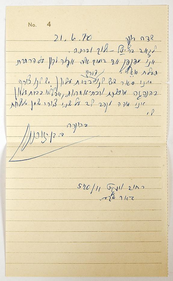 Ben-Gurion, David. Autograph letter signed ("D. Ben-Gurion"), 1p, 8¼x5", in Hebrew, on ruled paper with a printed "4" at the top, Sdeh Boker, June 21, 1970. To P.Z. Hartal, veteran of the Six Day War, artist, poet, and author of "The Brush and the Compass" and "Toldot HaAdrichalut" (A History of Architecture). Fine. Accompanied by an English translation of Ben-Gurion's letter and a synopsis of Mr. Hartal 's letter to him.