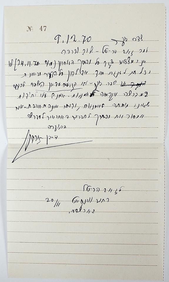 Ben-Gurion, David. Autograph letter signed ("D. Ben-Gurion"), 1p, 8½x5", in Hebrew, on ruled paper with a printed "47" at the top, Sdeh Boker, Dec. 9, 1970. To P.Z. Hartal, veteran of the Six Day War, artist, poet, and author of "The Brush and the Compass" and "Toldot HaAdrichalut (A History of Architecture). Fine. Accompanied by an English translation of Ben-Gurion's letter and a synopsis of Mr. Hartal 's letter to him.