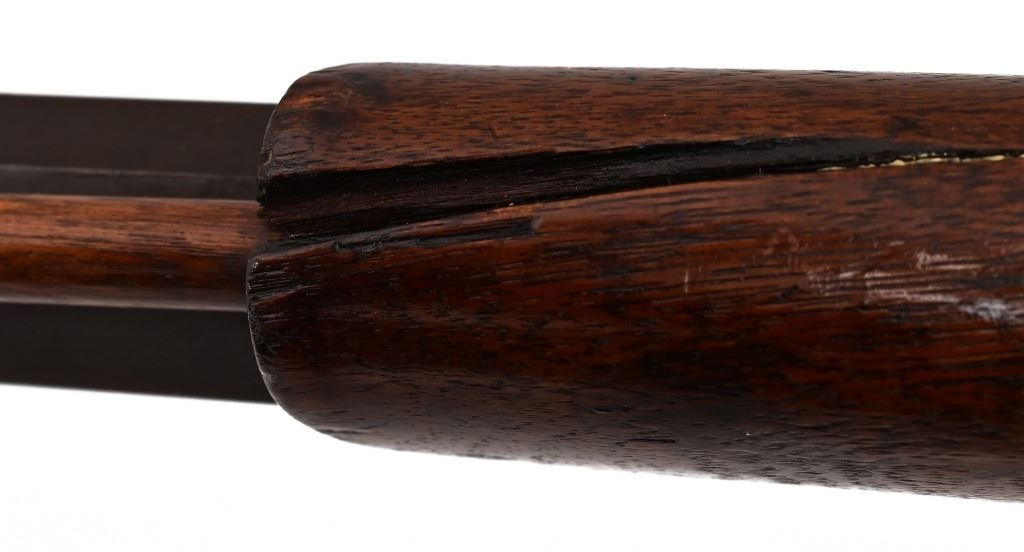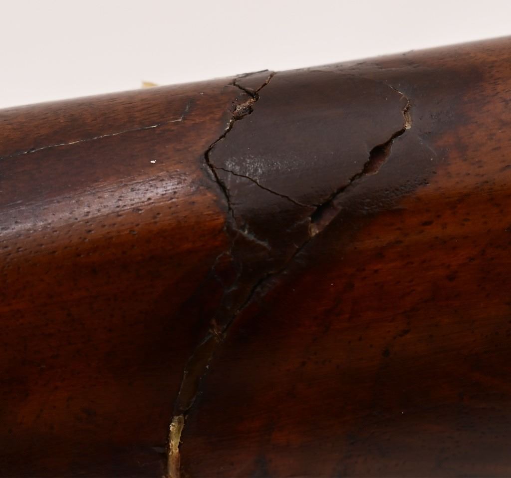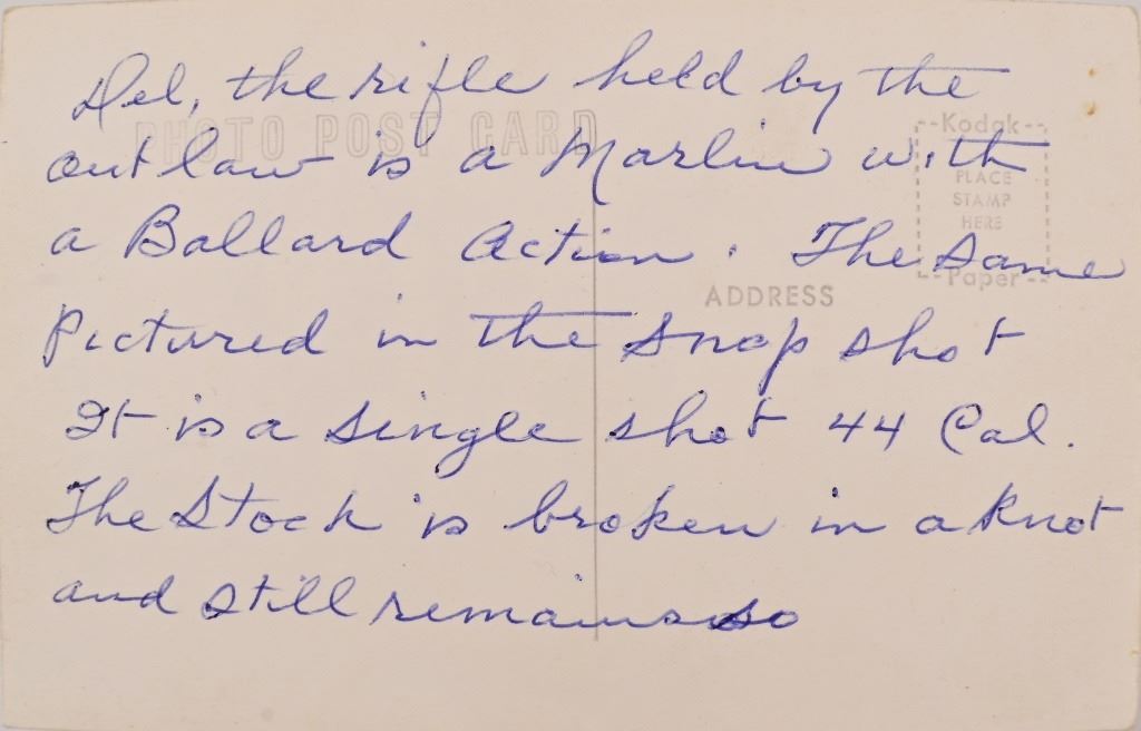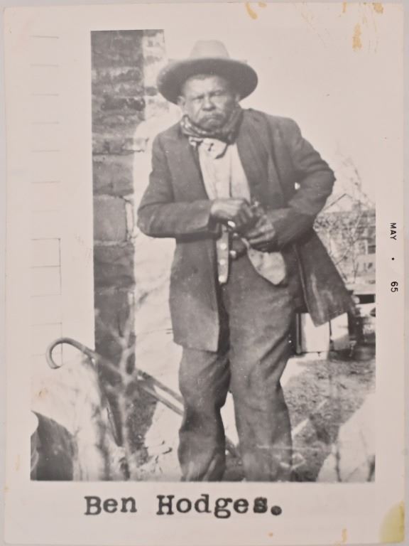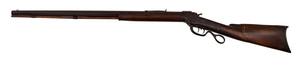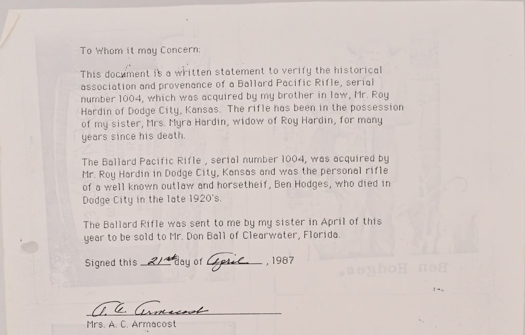 Ben Hodges Ballard Pacific rifle serial number 1004 chambered in 40-65B with a 30 " octagon barrel. Hodges is one of the few outlaws and cattlemen to survive the wild days in Dodge City. This rifle shows some wear and usage. The stock is cracked from Hodges striking a man in the head and killing him on the spot, He was strung up by bandits but was able to plead for his life. Before he was set free his Achilles tendon was cut and he had to use his rifle as a crutch. Old repair is noted on the stock where it was fixed. Metal is a dark grey patina with surface oxidation present. Bore is good shows areas of frosting and pitting in the grooves. Action functions correctly.