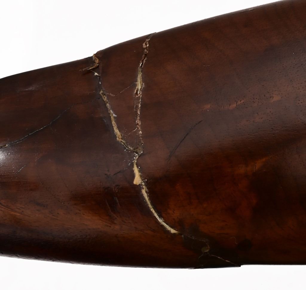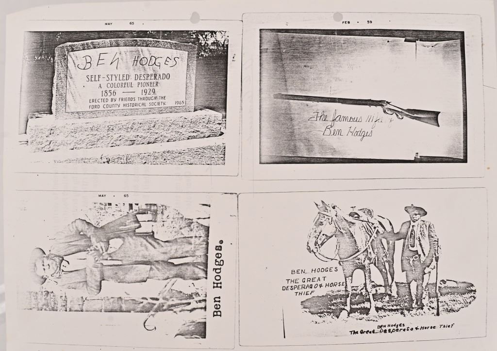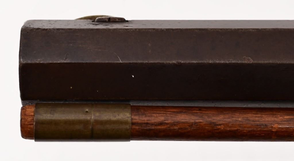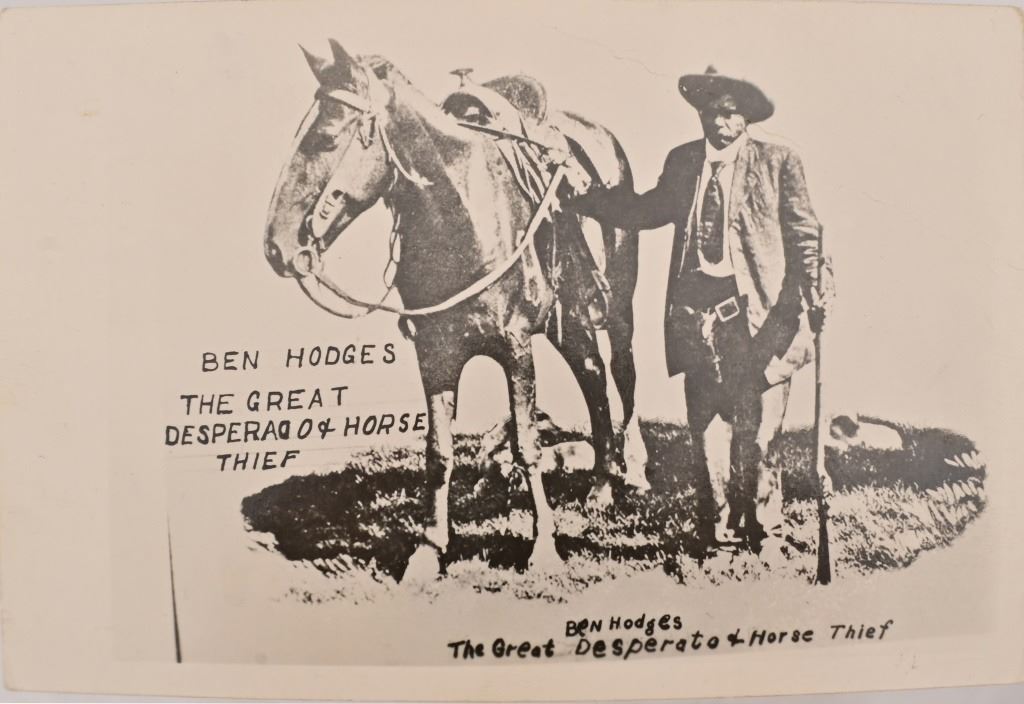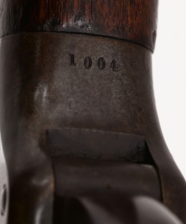 Ben Hodges Ballard Pacific rifle serial number 1004 chambered in 40-65B with a 30 " octagon barrel. Hodges is one of the few outlaws and cattlemen to survive the wild days in Dodge City. This rifle shows some wear and usage. The stock is cracked from Hodges striking a man in the head and killing him on the spot, He was strung up by bandits but was able to plead for his life. Before he was set free his Achilles tendon was cut and he had to use his rifle as a crutch. Old repair is noted on the stock where it was fixed. Metal is a dark grey patina with surface oxidation present. Bore is good shows areas of frosting and pitting in the grooves. Action functions correctly.
