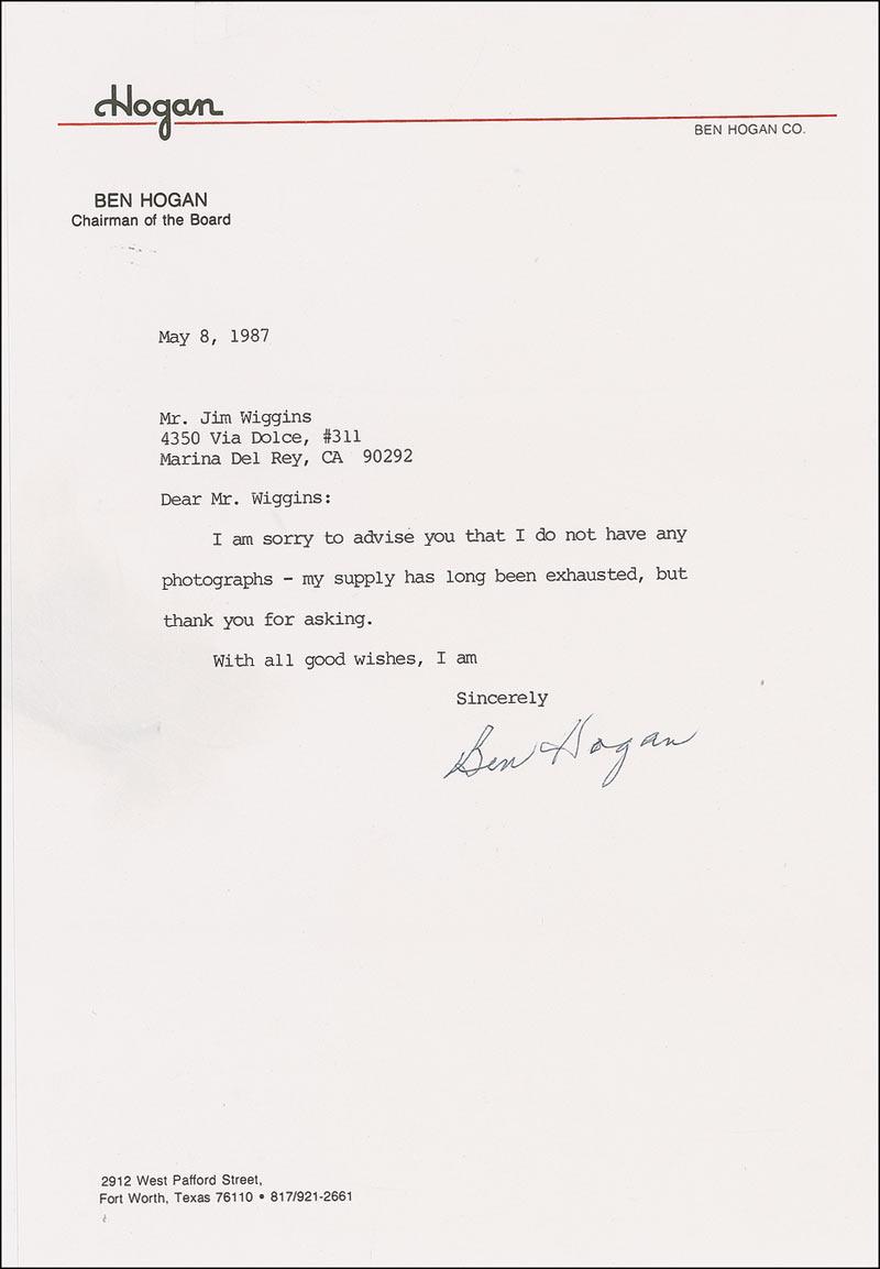 TLS, one page, 7.25 x 10.5, Ben Hogan Co. letterhead, May 8, 1987. In full: “I am sorry to advise you that I do not have any photographs—my supply has long been exhausted, but thank you for asking.” In fine condition, with a couple of tiny creases.