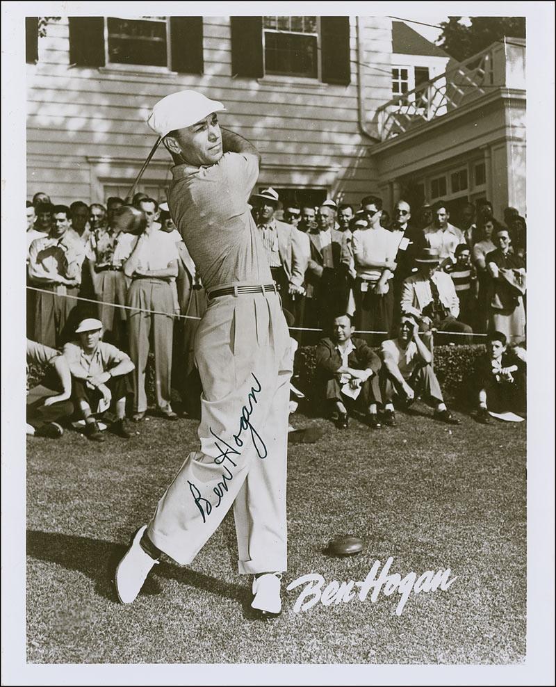 Glossy 8 x 10 photo of Hogan teeing off in front of a gallery, signed in black felt tip. In very fine condition.