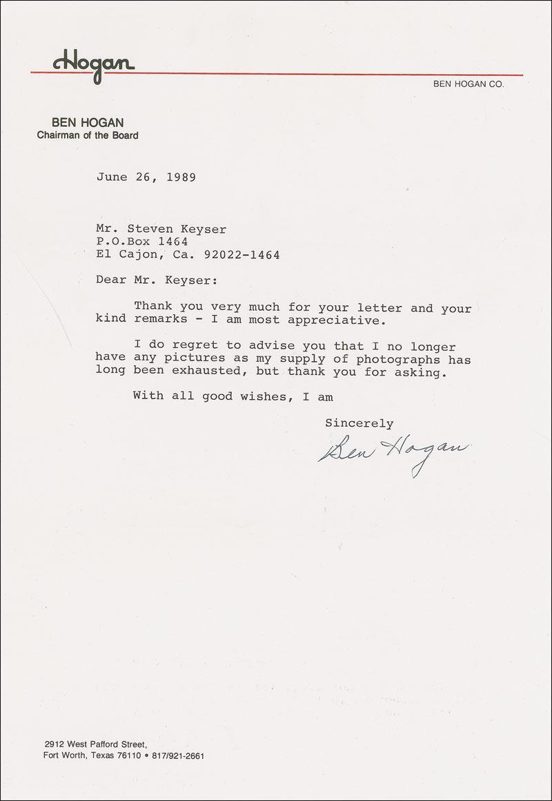 TLS, one page, 7.25 x 10.5, Ben Hogan Co. letterhead, June 26, 1989. In full: “Thank you very much for your letter and your kind remarks—I am most appreciative. I do regret to advise you that I no longer have any pictures as my supply of photographs has long been exhausted, but thank you for asking.” In fine condition with a few light wrinkles. Accompanied by the original mailing envelope.