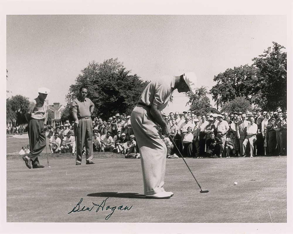Glossy 10 x 8 photo of Hogan putting during a tournament, signed in black felt tip. In fine condition.