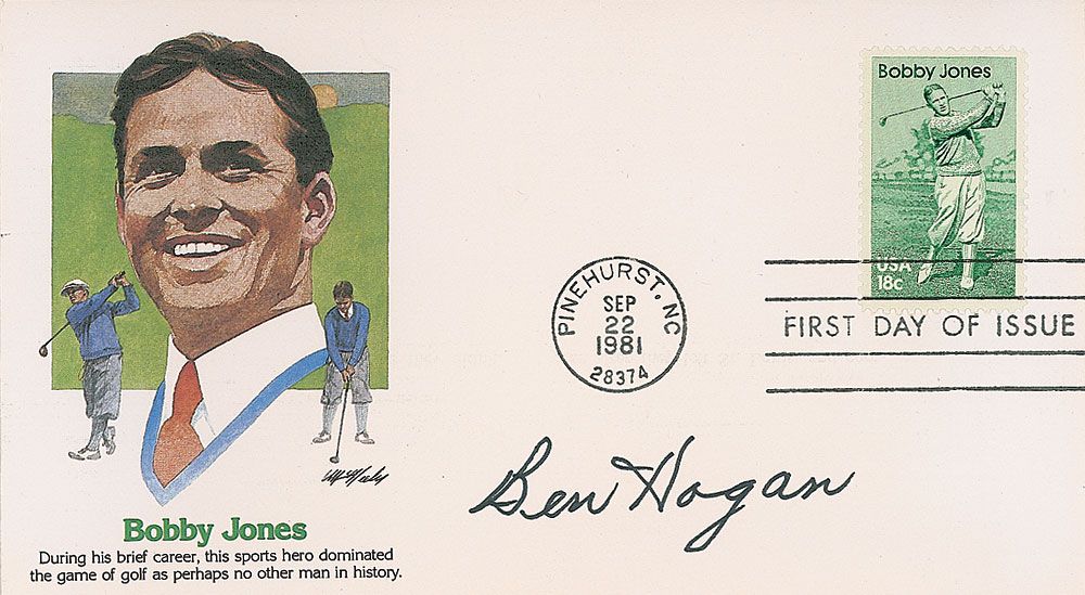 FDC with a cachet honoring Bobby Jones, signed in black felt tip by Hogan. In very fine condition.