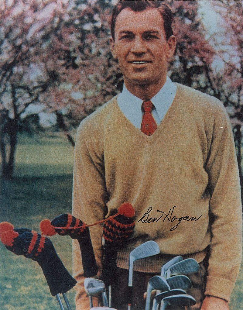 Color glossy 8 x 10 photo of Hogan posing behind his golf bag, signed in black felt tip. In very fine condition.