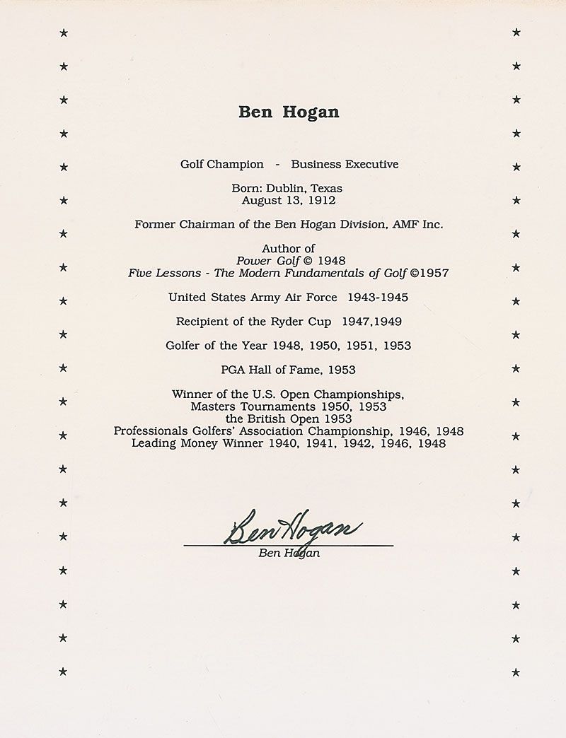 Printed fact sheet, one page, 8.5 x 11, chronicling Hogan’s accomplishments on the links, signed at the conclusion in black felt tip. In fine condition.