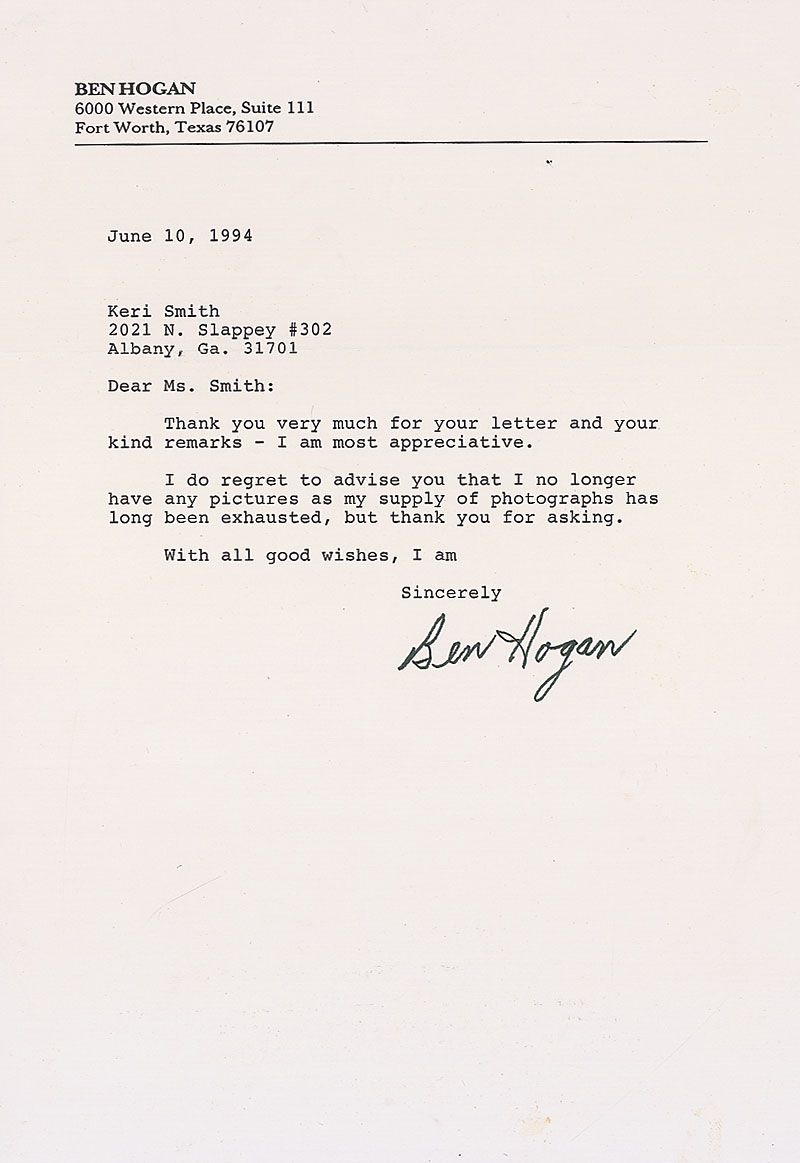 ALS, one page, 7.25 x 10.25, personal letterhead, June 10, 1994. Response to an autograph request. In part: “I do regret to advise you that I no longer have any pictures as my supply of photographs has long been exhausted.” In fine condition. Accompanied by the original mailing envelope.