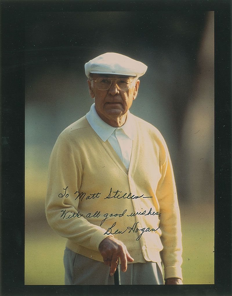 Color glossy 8.5 x 11 photo of an older Hogan on the golf course, signed and inscribed in black felt tip, “To Matt Stiller—with all good wishes, Ben Hogan.” In fine condition.