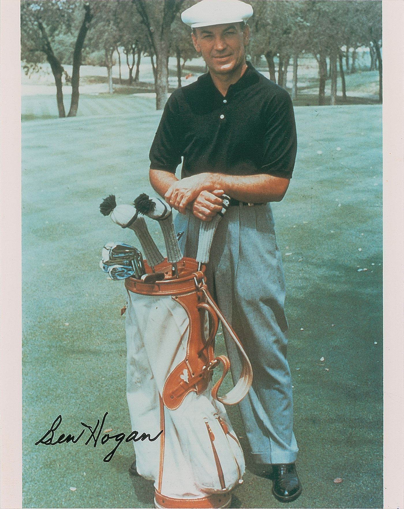 Color glossy 8 x 10 photo of Hogan on the fairway with his golf bag, signed in black felt tip. In fine condition.