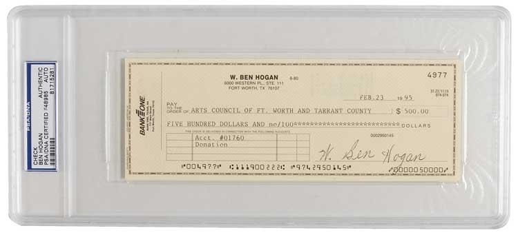 Personal check, 8.25 x 3, filled out in type and signed by Hogan, “W. Ben Hogan,” payable to Arts Council of Ft. Worth and Tarrant County for $500.00, February 23, 1995. Encapsulated in a plastic PSA/DNA authentication holder and accompanied by a certificate of authenticity from PSA/DNA. In fine condition, with slight show-through from a stamp on reverse. RRAuction COA.