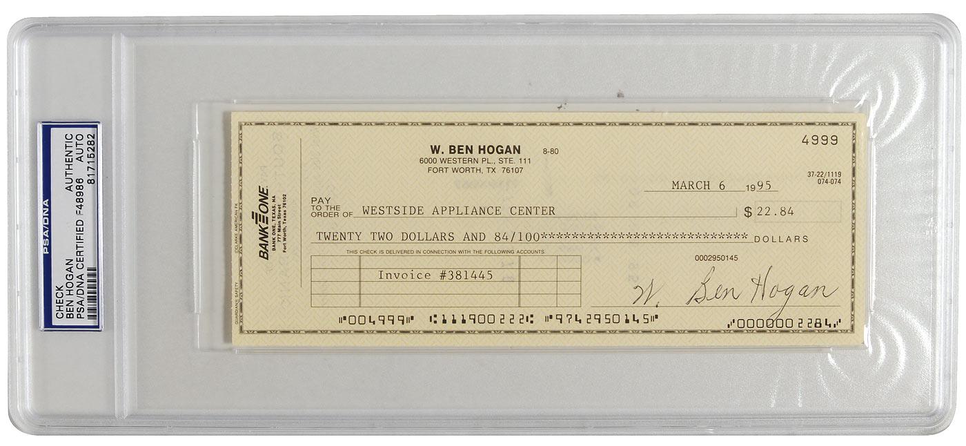 Personal check, 8.25 x 3, filled out in type and signed by Hogan, “W. Ben Hogan,” payable to Westside Appliance Center for $22.84, March 6, 1995. Encapsulated in a plastic PSA/DNA authentication holder and accompanied by a certificate of authenticity from PSA/DNA. In fine condition, with slight show-through from stamps on reverse. RRAuction COA.