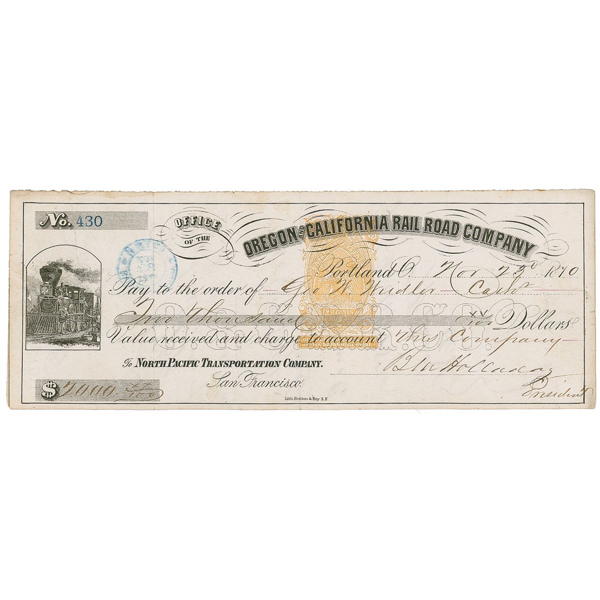 American transportation businessman (1819-1887) known as the ‘Stagecoach King’ until his routes were taken over by Wells Fargo in 1866. Oregon & California Rail Road Company business check, 9 x 3.25, filled out in another hand and signed by Holladay, payable to Geo. W. Weidler for $2000.00, November 23, 1870. In very good condition, with three vertical folds, one passing through a single letter of the signature, scattered toning, with heavier areas along the edges, and the expected cancellation stamps, none of which affect the signature.