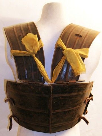 From the 1959 epic adventure 'Ben Hur,' this is a full-size metal chest and back 'battle' armor piece. The armor is made from hand-forged tin or sheet metal with large bent metal 'shoulder harnesses' riveted to the front and back. The sides are fastenable with small leather straps. The exterior of the armor is somewhat rusted and the foam lining inside is crumbling off. There is a cloth yellow bow tied through the shoulder plates on the reverse. (measures approx. 18" tall, 16" across). Oversized item. Additional postage required. This collection of 'Ben Hur' memorabilia came from an estate in New Jersey with the original purchase dating back to the early 70's from the David Weisz studios auction in Los Angeles. This collector passed away recently and the 45 year old collection was sold recently at Berman's Auction Gallery.
