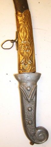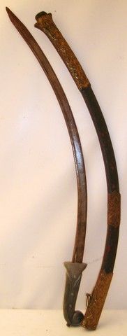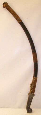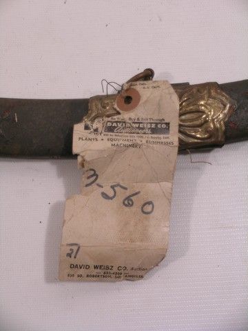A large size Roman soldier's sword and scabbard from the 1959 Charlton Heston epic adventure 'Ben Hur.' The sword is constructed from a heavy duty, curved steel blade that fastens into an engraved steel handle. The scabbard is made from steel as well with three engraved, thin brass sections added along the length. Shows signs of rust and wear, with some minor paint chipping. Comes with a vintage wardrobe tag affixed with a thin metal wire. (measures approx. 32 1/2" long). This collection of 'Ben Hur' memorabilia came from an estate in New Jersey with the original purchase dating back to the early 70's from the David Weisz studios auction in Los Angeles. Oversized item. Additional Postage Required.