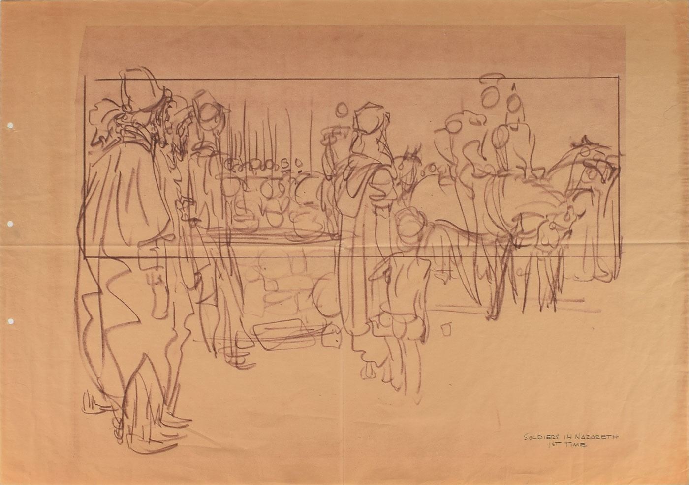 (MGM, 1959) Rare printed brown line pre-production artwork from the historical epic Ben-Hur, 30 x 21, annotated in pencil in the lower right, "Soldiers in Nazareth, 1st Time." In very good to fine condition, with scattered light creasing, and light staining to the right edge. A true classic, Ben-Hur won eleven Oscars at the 1960 Academy Awards—including Best Art Direction - Set Decoration, Color, and Best Costume Design, Color.