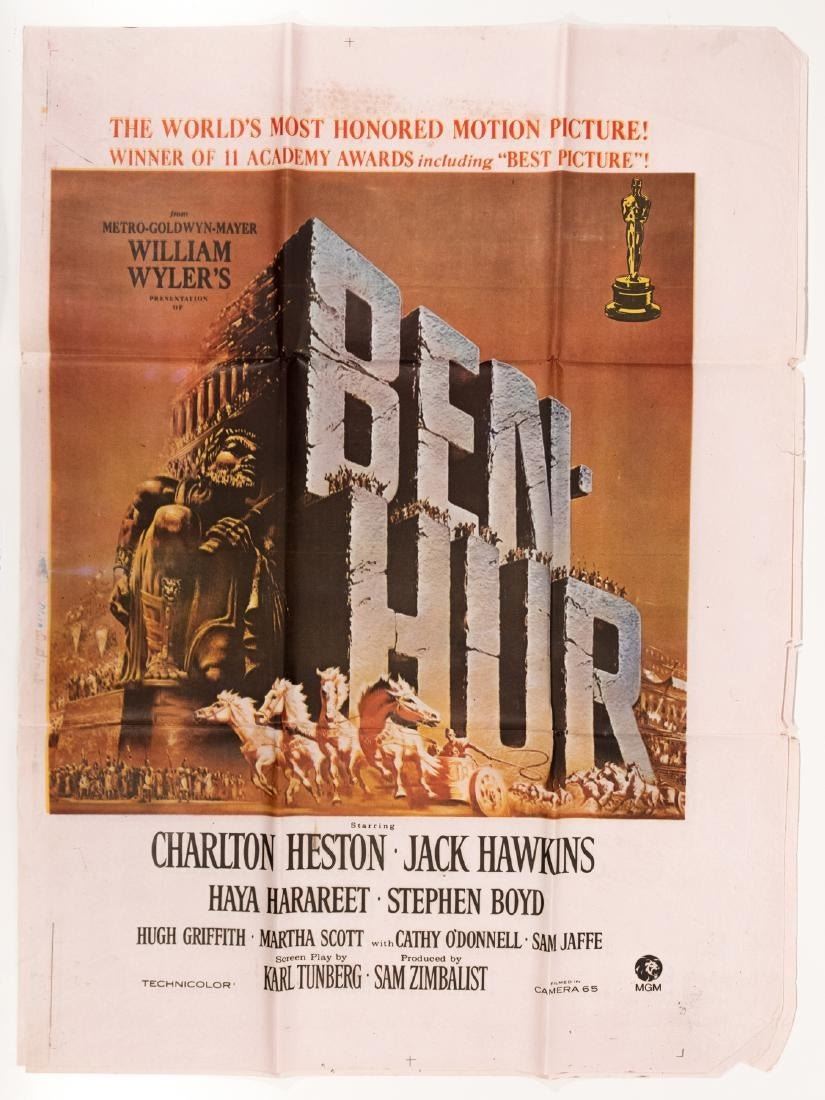 "Ben Hur" 1959 film praised on the poster as "The World's Most Honored Motion Picture!" Original folds, unmounted 38"x 29".