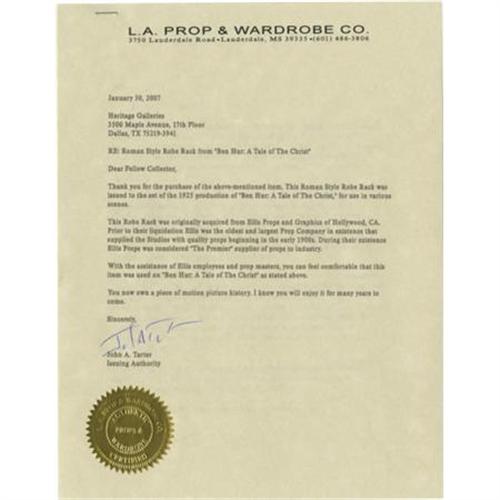 <B>"Ben-Hur" Robe Rack.</B></I> A prop steel robe rack that stands 59" in height, used in the classic 1959 historical epic starring Charlton Heston. In Fine to Very Fine condition with a heavy amount of rust. <I> Accompanied by COA from L.A. Prop and Wardrobe Co.</B></I><BR><BR><b>Shipping:</b> Requires 3rd Party Shipping (<a target="_blank" href="http://www.heritageauctions.com/common/shipping.php">view shipping information</a>)
