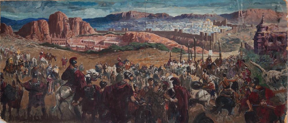 (MGM, 1959) Original design concept painting accomplished in tempera on a 16 ½ in. x 30 in. leaf of artist’s illustration board, depicting the Roman soldiers massed on the hills overlooking Jerusalem. From the collection of the film’s art director Edward Carfagno. It exhibits some wear at the edges, chipping loss at lower corners and trace of damp stain at the upper corners, but remains in very good condition.
