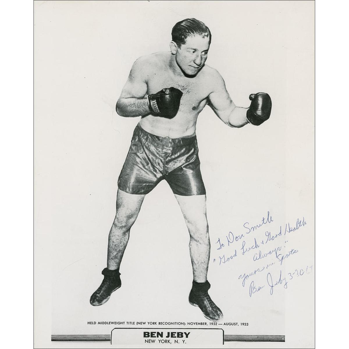 Boxer (1909–1985) who was world middleweight champion in 1933. Vintage glossy 8 x 10 photo, signed and inscribed in blue ballpoint “To Don Smith, ‘Good Luck & Good Health Always.’ Yours in Sports. Ben Jeby, 3-30-67.” Scattered creasing, a few touching his body, some surface scratches, the date a shade light, and a PSA/DNA authentication label affixed to the back, otherwise fine condition. Accompanied by a certificate of authenticity from PSA/DNA.