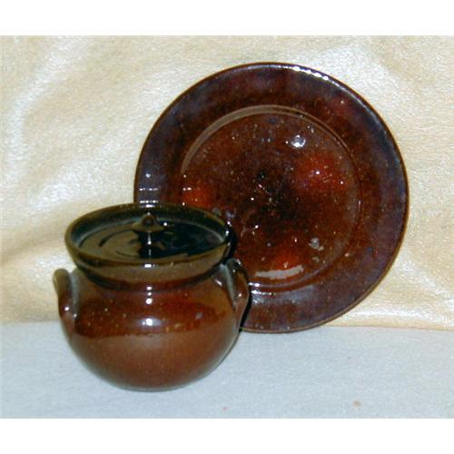 Flash affects coloration. Pot is all one shiney color and top does not come off. Pot has 3 clay spots on bottom, plate has 3 dark spots on top. Plate is 6.25" wide. Buyer pays shiping and handling costs.