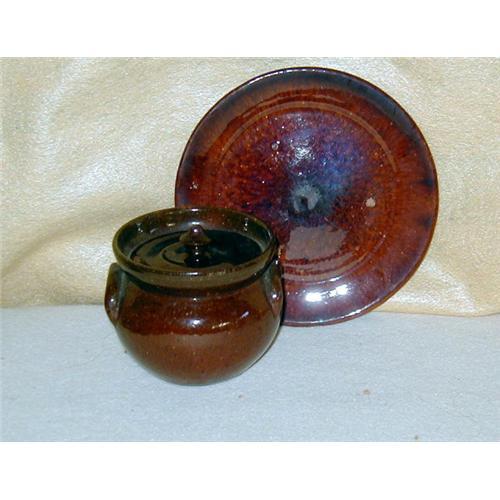 Ben Owen, North Carolina, covered pot signed master potter. Lovely dark glaze brown with 2 handles. Top is not removeable and has 2 handles, one tiny clay spot on rim. Included is a 6.25" round plate which has 3 clay spots on top, but do not detract from beauty of plate. The plate hasmore orange and purple tones. Buyer pays shipping and handling costs.