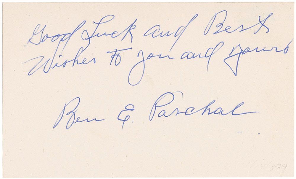 Outfielder (1895–1974) who played for the Cleveland Indians, Boston Red Sox, and New York Yankees, whom he helped to World Series victories in 1927 and 1928. On April 12, 1927, in the first game of the season, Paschal was the last player ever to pinch hit for Babe Ruth. Ballpoint signature and inscription, “Good luck and best wishes to you and yours, Ben E. Paschal,” on an off-white 5 x 3 card. In fine condition.