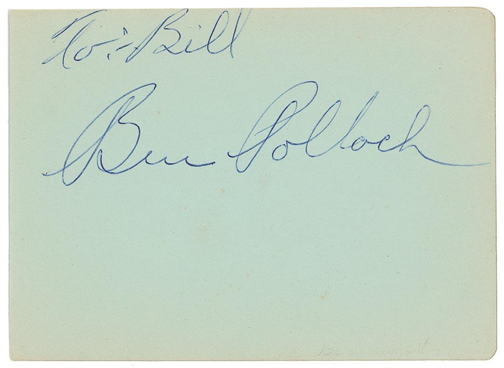 Known as the ‘Father of Swing,’ this drummer and bandleader discovered or employed such greats as Benny Goodman, Jack Teagarden, Glenn Miller, Jimmy McPartland and Harry James. Vintage ballpoint signature and inscription, “To: Bill, Ben Pollack,” on a light green 5.25 x 3.75 album page. In fine condition, with some mild edge toning, and a crease to top right corner.