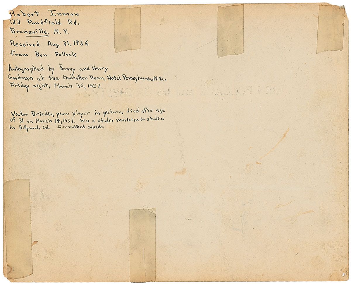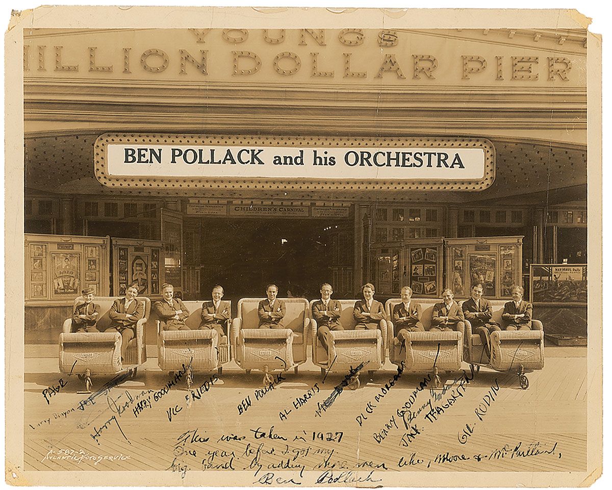Swing bandleader (1903–1971). Vintage glossy 10 x 8 photo of Ben Pollack and his Orchestra, signed in fountain pen by Harry Goodman, Benny Goodman, and Pollack, who writes, “This was taken in 1927, one year before I got my big band by adding more men like Moore & McPartland.” All members of the band are labeled in an unknown hand. In very good condition, with three heavy vertical folds, a few other creases, and small tack holes and paper loss to corners.