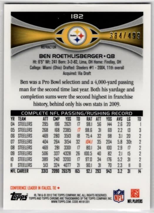 Ben Roethlisberger Purple Refractor /499 2012 Topps Chrome #182