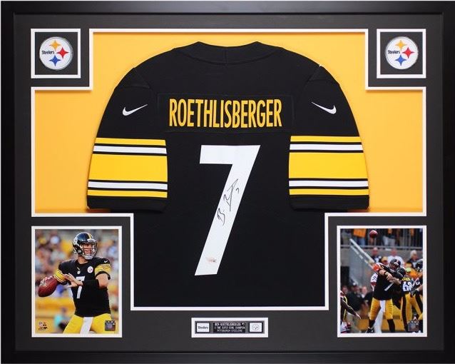 Jersey Details: The Jersey is a Black Ben Roethlisberger Pittsburgh Steelers Nike Limited Jersey and the name and numbers are stitched onto the Jersey.Autograph Certification: The Autograph is Fanatics Certified and the Jersey has the Fanatics sticker and the paper certificate will be attached to the back of the frame. Fanatics is one of the leading authenticators in the memorabilia industry, so you can be 100% certain this autograph is authentic.Quality: Our framers take extreme care and pride in making your Framed Sports Jersey and only use the highest quality materials and licensed products. This Framed Sports Jersey will look absolutely gorgeous in your home or office and comes ready to hang right out of the box.Framing DetailsFrame: 35" X 43" Black SOLID WOOD FrameGlass: UV Protected AcrylicMatting: Triple Acid Free Team Colored Matting (made especially for framing sports memorabilia)Patches: Stitched Team Logo PatchesPictures: Licensed 8" X 10" Pictures (with Holograms where available)Name Plate: Includes Players Name with Career Achievement(s). This item comes with a Certificate of Authenticity from a third party authenticator. This Certification of Authenticity does not imply that the item will be certified by any other rival authentication companies. The accompanied certification is the only certification the auction company can confirm. These items are being sold as collectable pieces and there is no guarantee that this item can be resold on any online marketplace. Each of these companies has their own policies and politics.