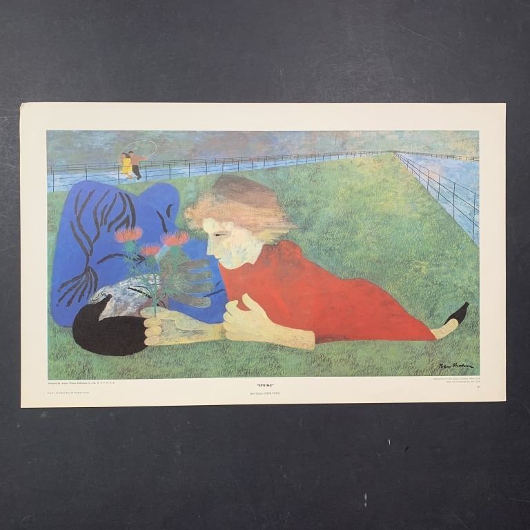 Ben Shahn's "Spring" Open Edition Print. A child lays in the grass while examining a freshly plucked plant. Some children skip rope outside the fence. This piece is signed in the lower right. There is a small dog-ear in the upper left corner but otherwise in good condition.