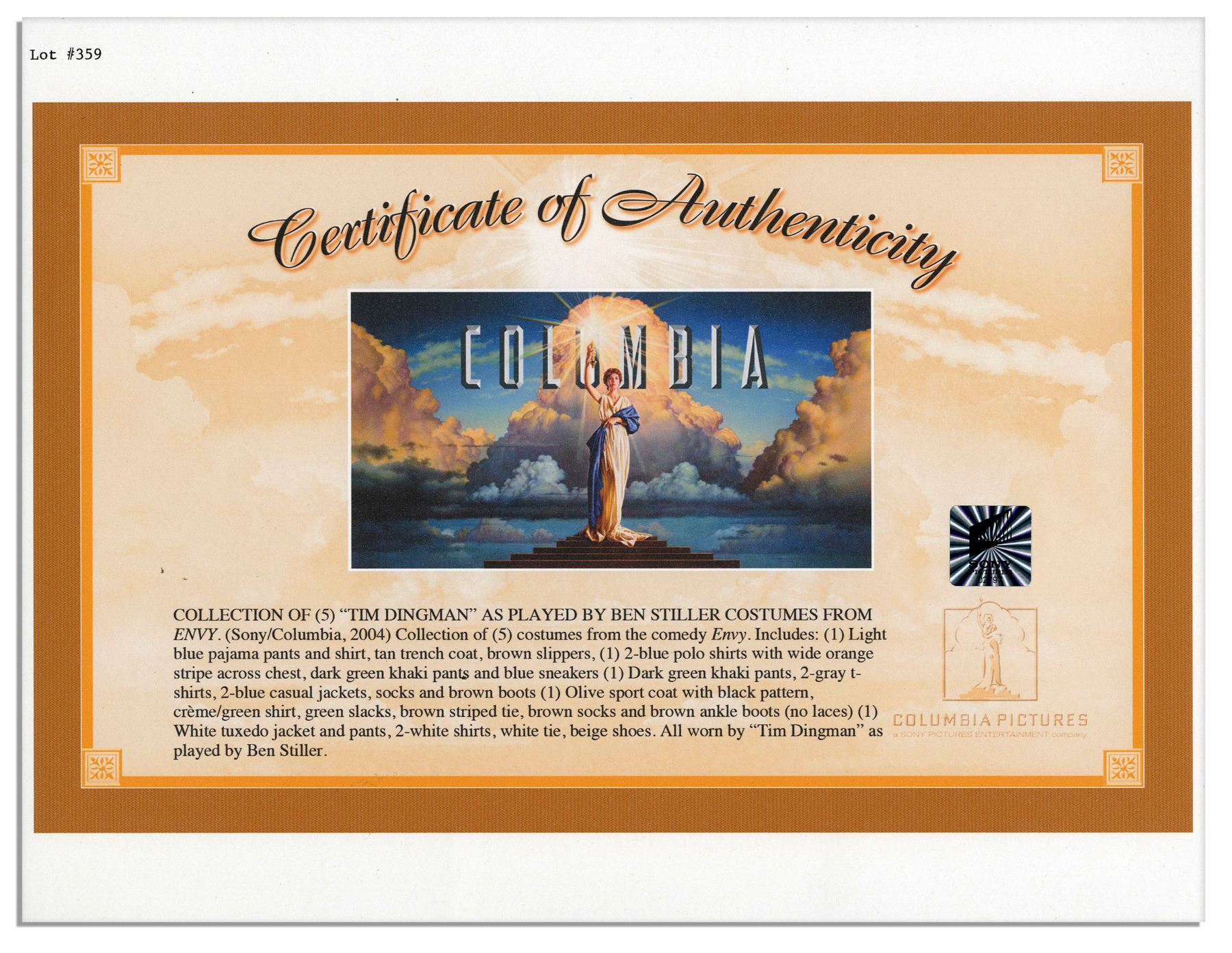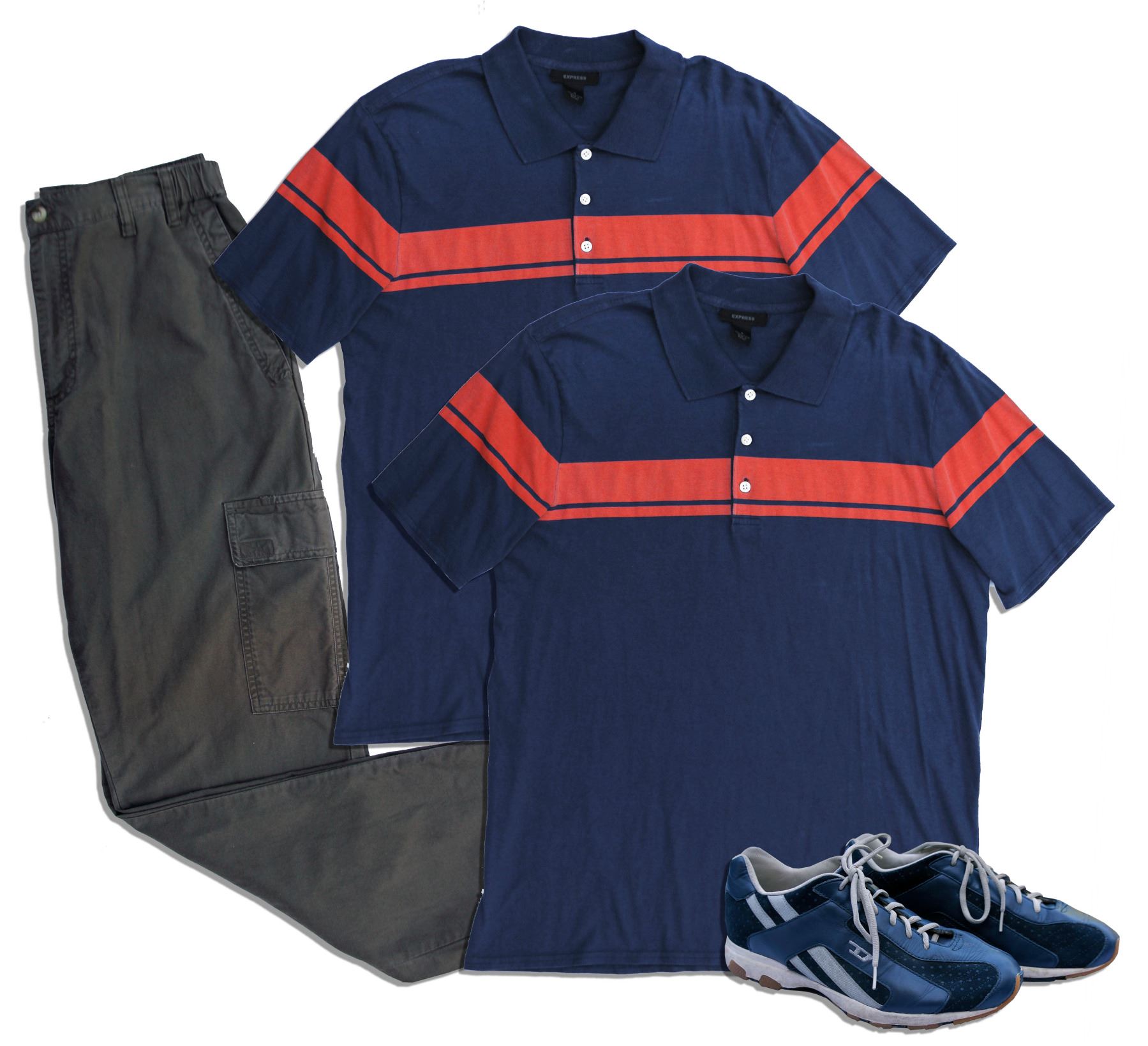 Ben Stiller ''Envy'' wardrobe. Stiller stars in the 2004 comedy as Jack Black's envious buddy. Complete outfit includes (1-2) an identical pair of navy blue polo shirts with horizontal orange stripe by Express in size M, (3) khaki green flat-front pants by Columbia in size 32 x 32, (4) pair of blue suede sneakers by Diesel in size 11, (5) pair of brown socks. Some wear to shoes, otherwise lot is near fine. Accompanied by the Sony/Columbia Pictures costume department tag, and photocopy of the Sony/Columbia Pictures COA descriping the pieces in detail.