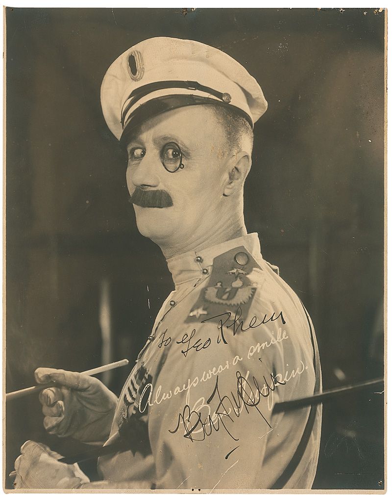 Vintage matte-finish 7.5 x 9.5 photo of Turpin in military attire and monocle, signed and inscribed to assistant director George Rhein in fountain pen “To Geo Rhein, Ben Turpin.” Affixed to a cardstock mount of the same size. In very good condition, with several pin holes to edges, lightly trimmed edges, and a few spots of surface rubbing and scratches.